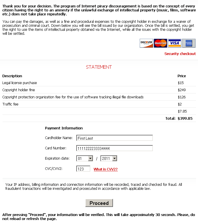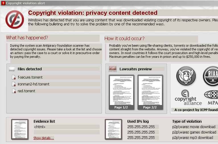 The victim is informed that an "Antipiracy foundation scanner" has found illegal torrents from the system. If he won't pay $400 (via a credit card transaction), he might face jail time and huge fines.